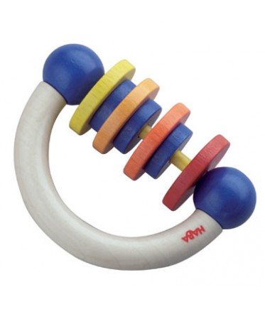 Clicking and clacking wooden discs on a metal rod. Made from maple, beech and metal. Measures 4` across. Recommended for 6 months and up. Made in Germany.