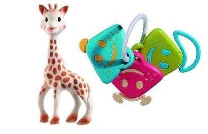 Soft, light and easy to grasp, Sophie The Giraffe is perfect for little hands and makes a happy sound when squeezed. Babies especially love her bumpy head to sooth their teething gums. Natural Rubber, Food Grade Paint, BPA Free, phthalate-free. The colorful Rattle Keys by Vulli are both a rattle and teething toy! Combining flexible and rigid plastic, this rattle is ideal for chewing. Lots of activities to discover: 3 heads shaped keys to shake up, bright colors to intrigue baby and a soft chewy texture to teeth on makes this the perfect baby toy!