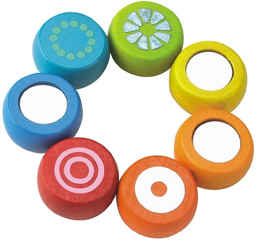 For first grabbing and rattling. Wooden shapes threaded on elastic. A brightly colored Soft Rattle snake with shimmering foil, perfect for little hands!