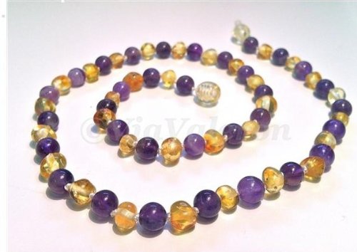 Genuine Baltic Amber and Amethyst gemstone necklace. This necklace is individually knotted between each bead on 100% silk thread. Necklace fastens with a plastic screw clasp closure. Each necklace is 12-12.5 inches in length.WHAT IS A BALTIC AMBER/AMETHYST NECKLACE? A Baltic amber necklace is made for wearing (not chewing) when a baby is teething to reduce inflammation in the body. The warmth from the skin releases the active ingredient in the Baltic amber, succinic acid. Recent scientific research has proved that succinic acid has a very positive influence on the human body. It improves immunity and the balance of acids when absorbed into the bloodstream; it stimulates the thyroid glands to help reduce drooling when used for teething and soothes red inflamed cheeks. Amber's anti-inflammatory and therapeutic properties are recognized by allopathic medicine as a natural analgesic, which will help to relieve teething pain and calm a baby without resorting to drugs. The skin's warmth releases healing oils from the amber, a resin, which is absorbed into the bloodstream. Parent supervision is recommended at all times. WHY AMETHYSTAmethyst is considered a master healing stone and is often recommended for stress relief. Often used for it's calming properties, Amethyst is also commonly used to help aid in insomnia or babies who have trouble sleeping or relaxing. Also used for dispelling rage, anger, fear, and anxiety.