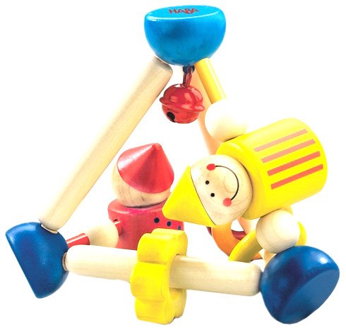 This larger size Soft Rattle comes with various play elements: a bell, rings, flower and clown figures.