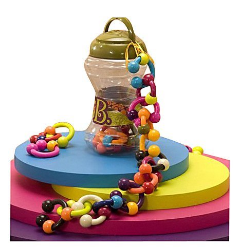 24 clackity colorful links. Each link is a rattle. Rounded plastic makes great teethers. Beads click, smooth plastic feels good in little hands.